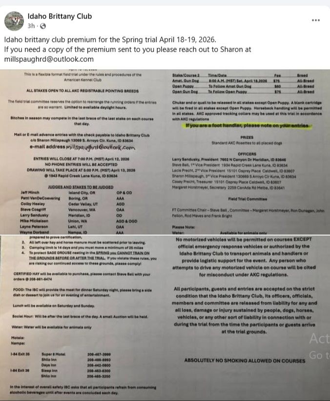 Our New event is coming up. See below for details of the Idaho Brittany Club Premium for the Spring trial, April 18-19, 2026.